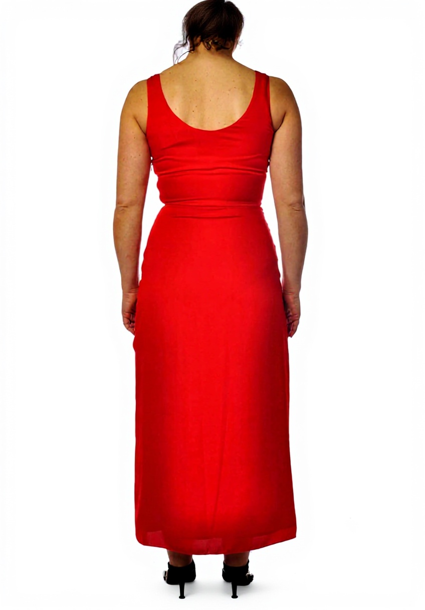 Questo abito presenta una silhouette lunga e fluida senza maniche, con un design pulito che esalta la femminilità, realizzato con materiali di qualità per garantire durata e una vestibilità ottimale in diverse situazioni.