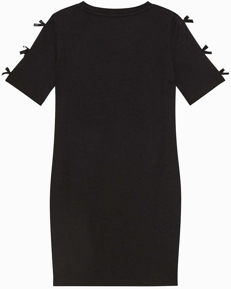 Questo abito nero di Patrizia Pepe si distingue per i fiocchi decorativi sulle maniche corte, che aggiungono un tocco di eleganza giovanile. Realizzato in tessuto stretch, offre una vestibilità slim che si adatta comodamente al corpo, garantendo libertà di movimento. La lunghezza mini lo rende adatto a diverse occasioni, dal quotidiano agli eventi speciali, con una finitura curata nei dettagli.