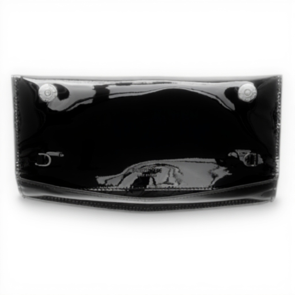 Questa pochette misura 28 x 16 cm con uno spessore di 2 cm, offrendo uno spazio sufficiente per oggetti essenziali come telefono, portafoglio e chiavi. Realizzata in materiale verniciato di alta qualità, assicura durabilità e un look impeccabile per ogni occasione.