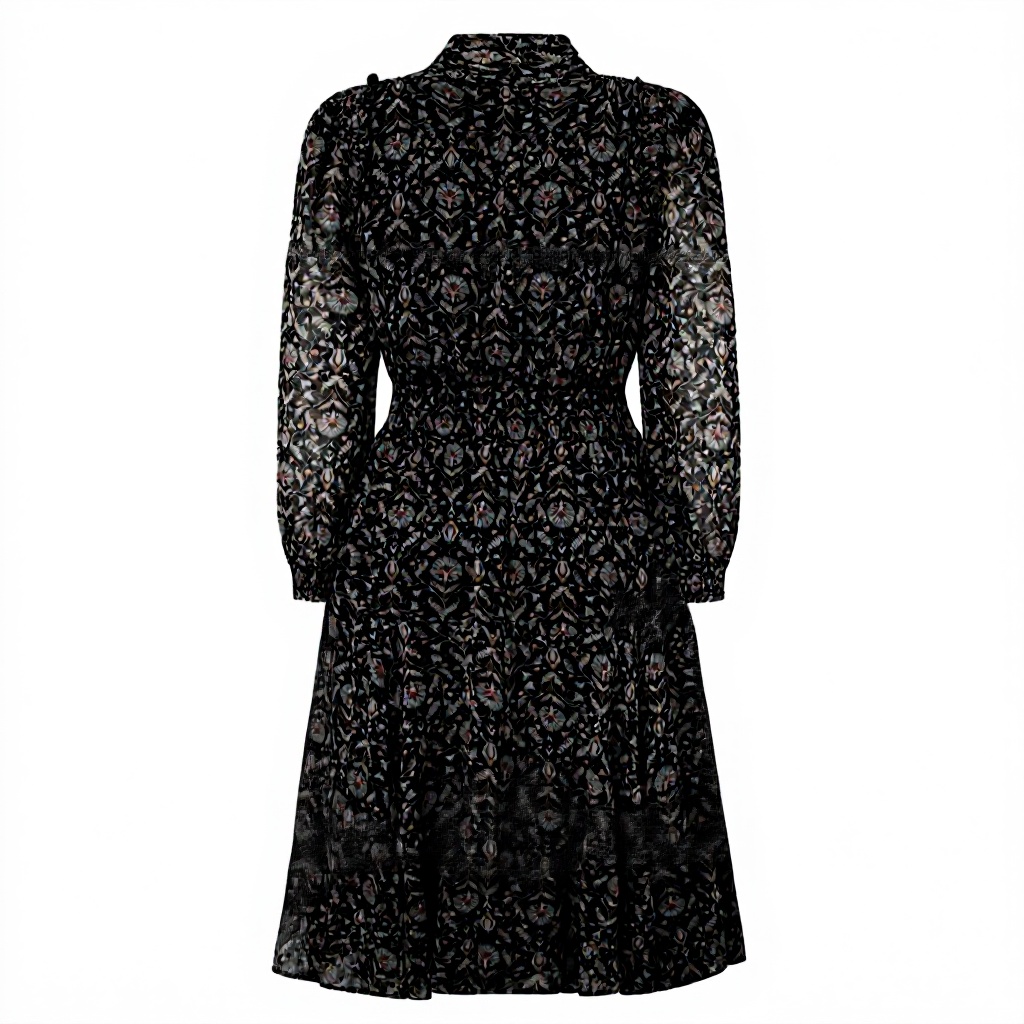 Il vestito è realizzato in chiffon, un tessuto leggero e traspirante, con finiture plumeti che ne esaltano l’aspetto.